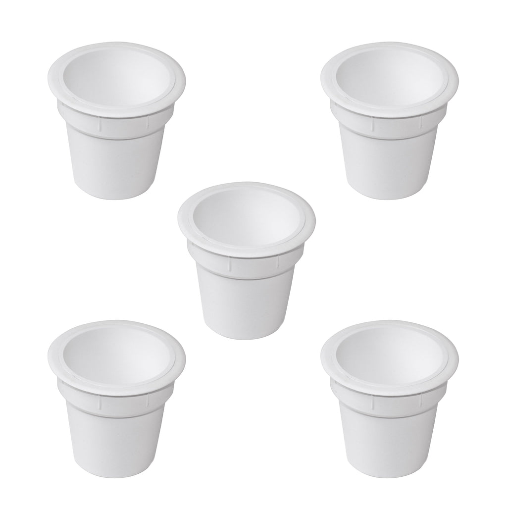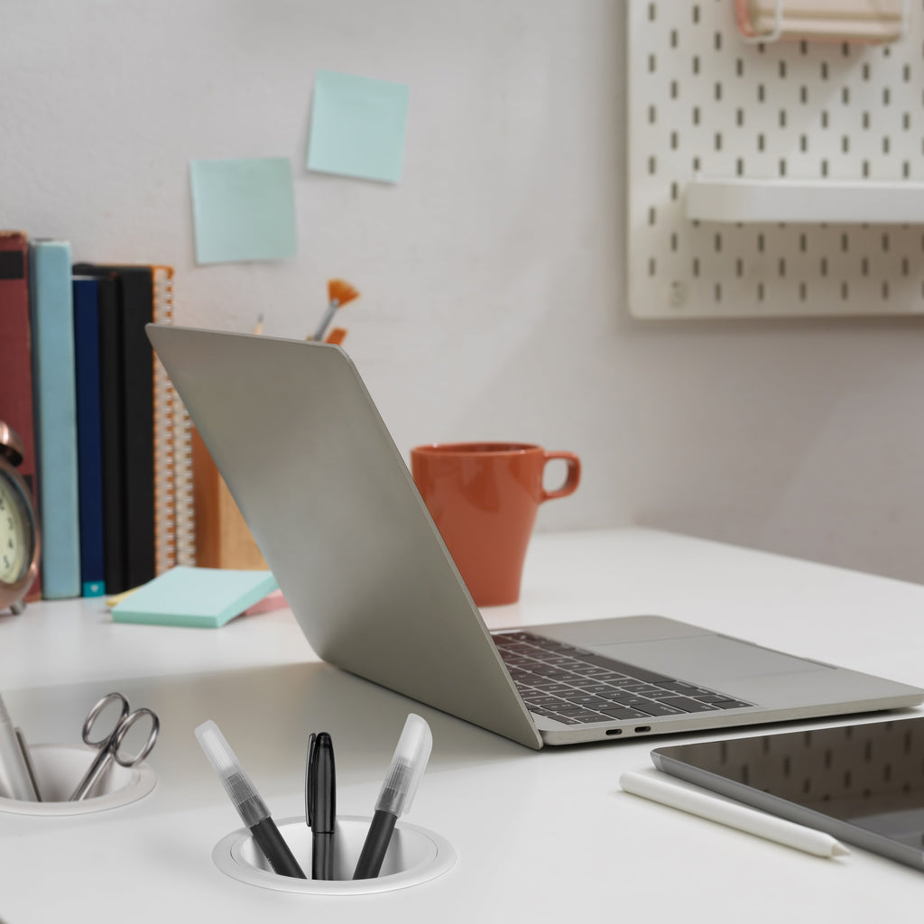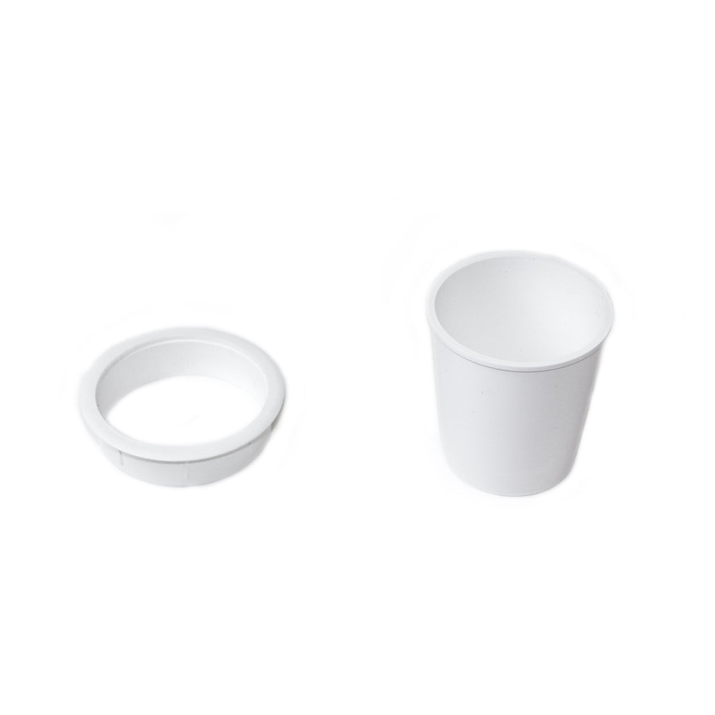 L'accessoire Pot peut être utilisé comme support de rangement, porte-stylo ou comme vase à fleurs pratique.Il est composé d'un anneau et d'un seau facilement amovibles pour le nettoyage et le déplacement. Il nécessite un usinage de Ø80mm pour pouvoir l'insérer dans le meuble. Les deux sont disponibles en finition noire ou blanche et sont vendus par lots de 5 accessoires.