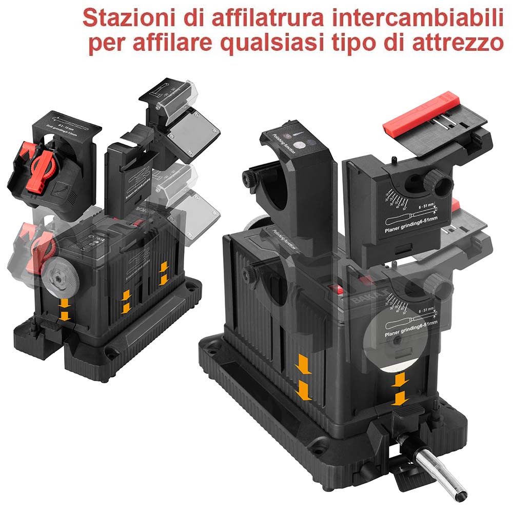 L'affilatore elettrico è fornito di ben 5 adattatori di affilatura uno per le lame di coltelli e forbici, uno per le punte da trapano e cacciaviti, uno per gli scalpelli, uno per accette e lame di grandi dimensioni e un adattatore da utilizzare con spazzole rotative e dischi da fresa ogni adattatore è intercambiabile e si inserisce molto velocemente sulla ruota affilatrice grazie al meccanismo scorrevole che permette di passare facilmente da un adattatore all'altro.