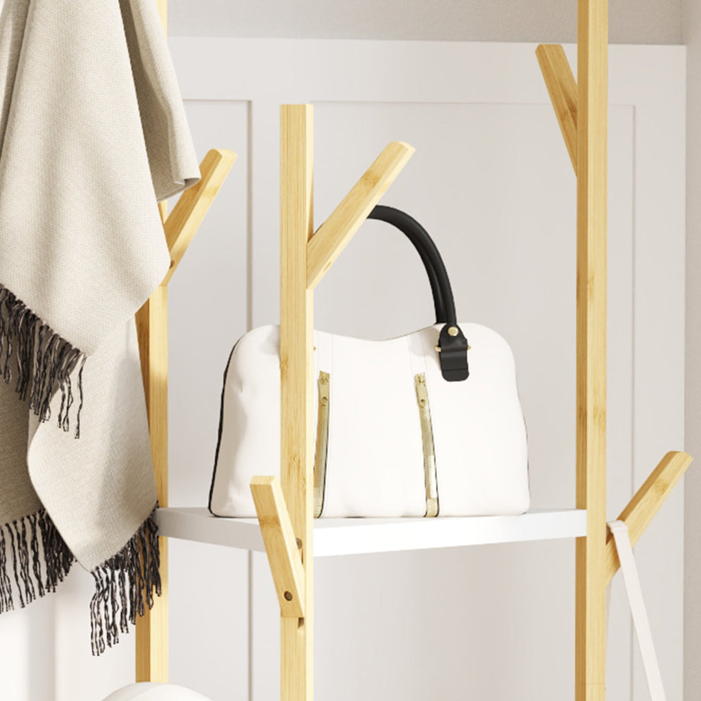 Albero Appendiabiti da Terra 45x45x170 cm con 8 Ganci e 3 Ripiani in Bambù Naturale e Bianco