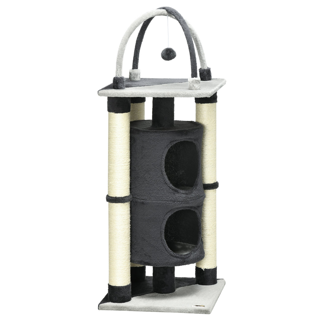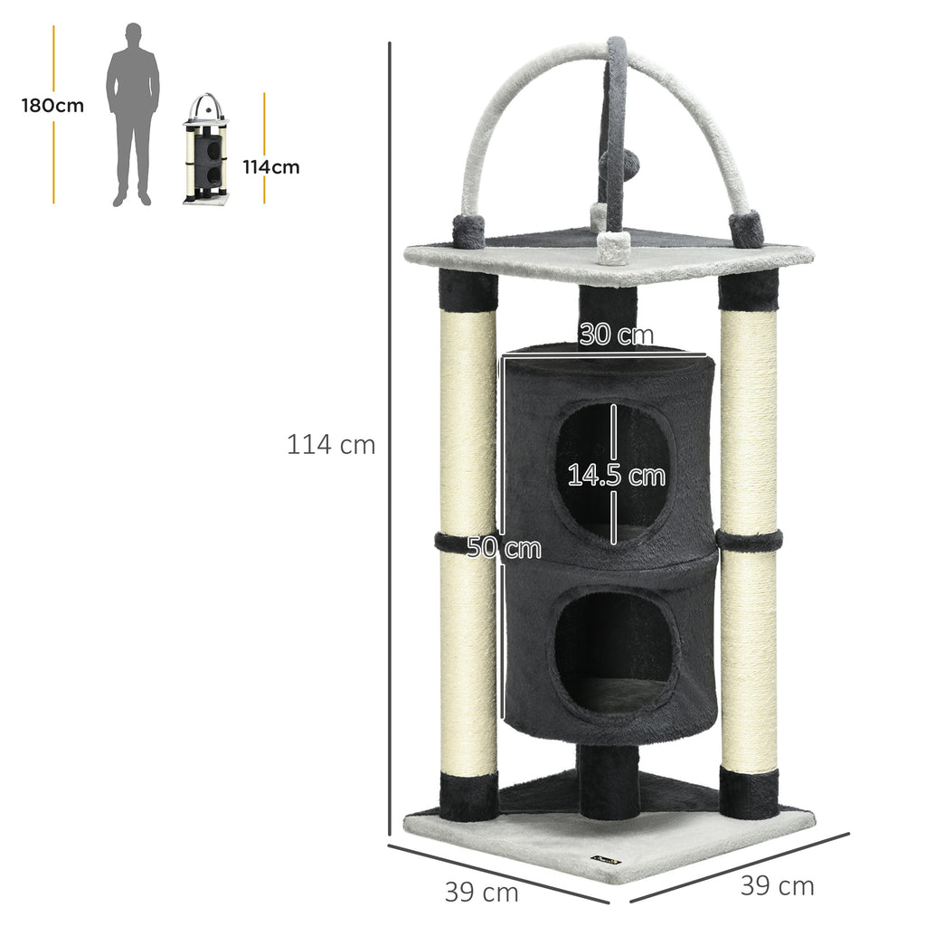 Arbre à chat avec maisonnette et ballon 39x39x114 cm en peluche et corde de jute gris foncé