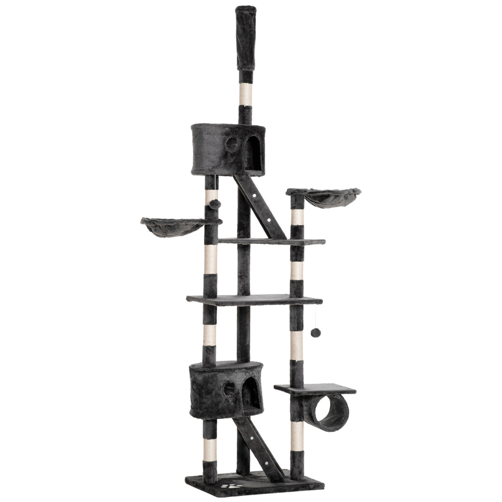 Albero Tiragraffi Multilivello a Soffitto Altezza Regolabile 240-260 cm con Casette e Letti in Peluche e Sisal Grigio