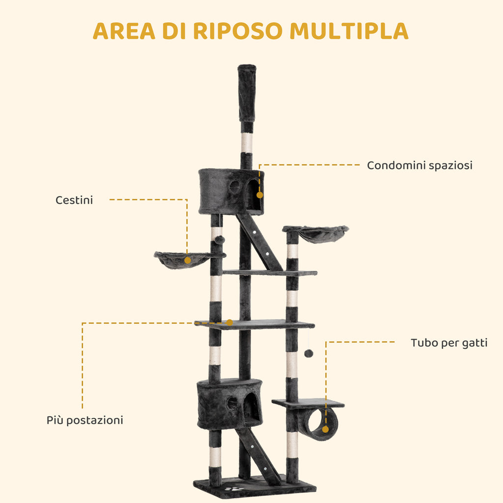 - TUTTO-IN-UNO: Questo grande tiragraffi per gatti ha un'altezza da 240-260 cm e può essere ancorato al soffitto grazie a una barra di fissaggio. È dotato di piattaforme, cucce, amache, scalette, giochi pendenti e pali tiragraffi per intrattenere a lungo i tuoi gatti e offrire loro molti spazi in cui riposare