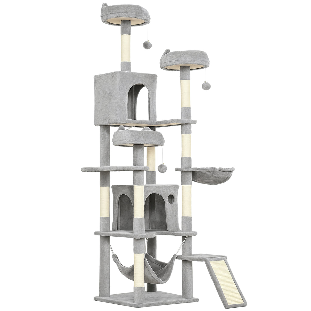 Questo albero tiragraffi per gatti di 192 cm multilivello rappresenta un parco giochi verticale per salti, arrampicate e relax. Sono presenti 3 trespoli, 2 ampie grotte e 2 amache per ospitare più gatti contemporaneamente nello stesso spazio. I pali in sisal naturale e la rampa tiragraffi proteggono i mobili e garantiscono divertimento continuo, mentre la struttura in truciolato robusto con copertura in peluche garantisce il giusto livello di comfort e sicurezza.