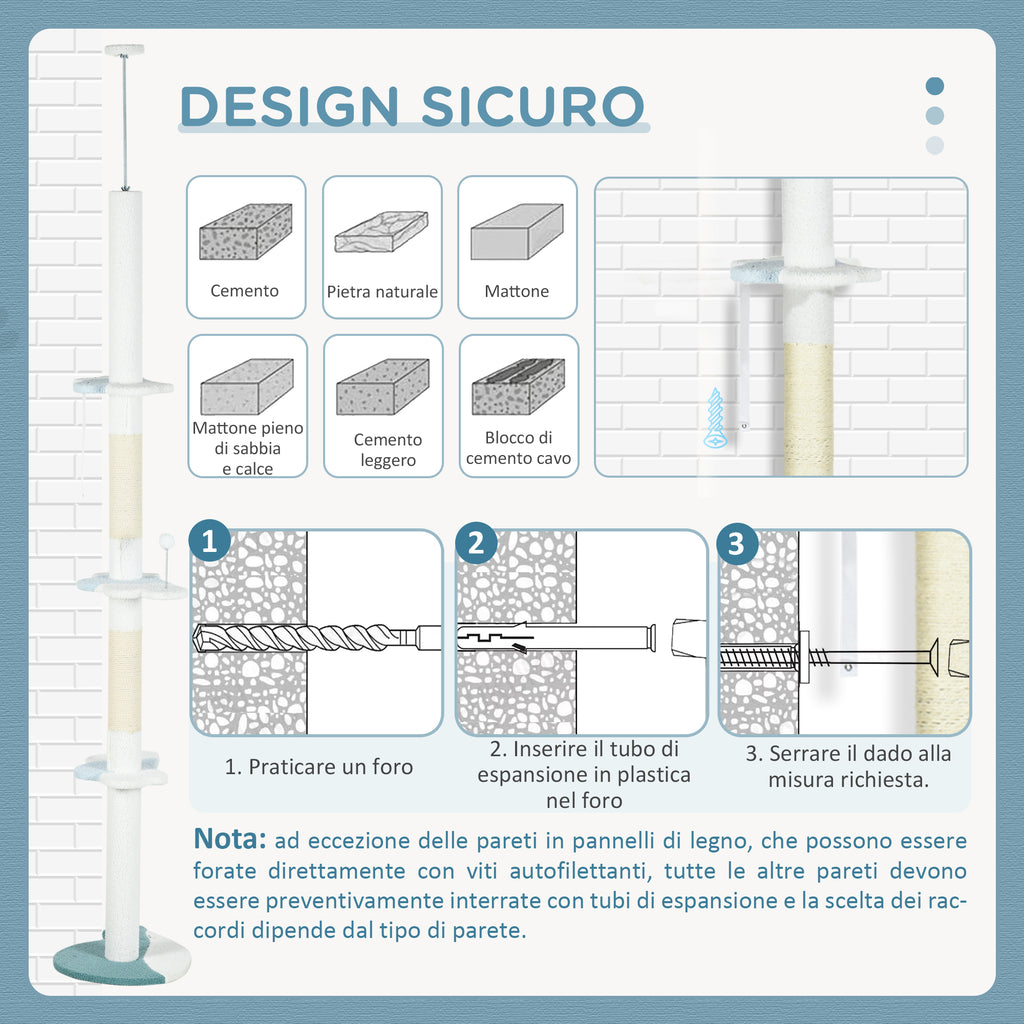 Questo ampio albero per gatti massimizza lo spazio, offrendo ai tuoi mici un luogo ideale per giocare o riposare. Adattabile a soffitti da 225 a 255 cm di altezza, garantisce stabilità e sicurezza, perfetto anche per gatti vivaci. Realizzato in truciolare, l'albero tiragraffi include diverse piattaforme, una base a forma di balena, una palla e un palo con corda di cotone per l'affilatura delle unghie.