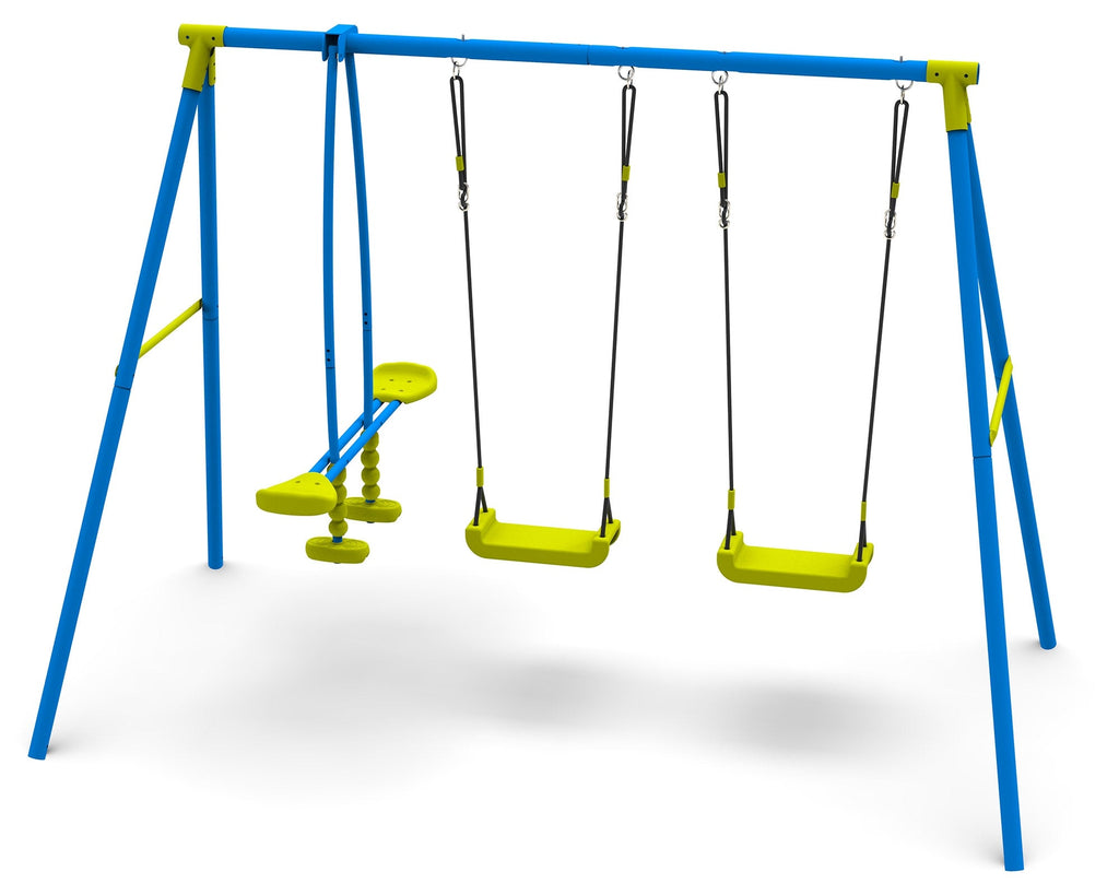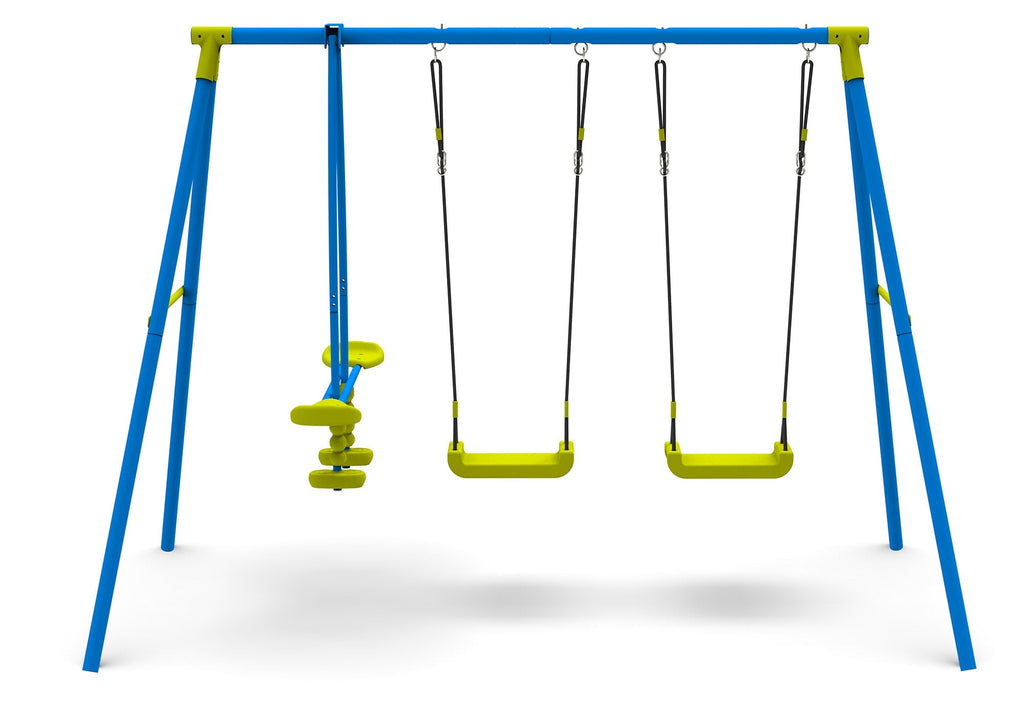 La balançoire est dotée d'un cadre en acier robuste et de sièges en plastique. Le diamètre des tubes est de 50 mm. À la base, il y a des pieds de fixation pour assurer une sécurité maximale et une adhérence au sol pendant l'utilisation.