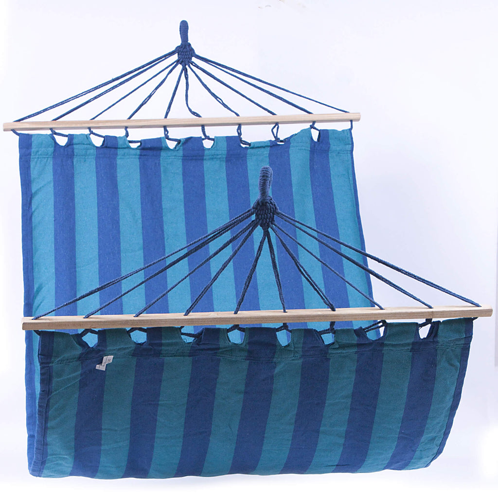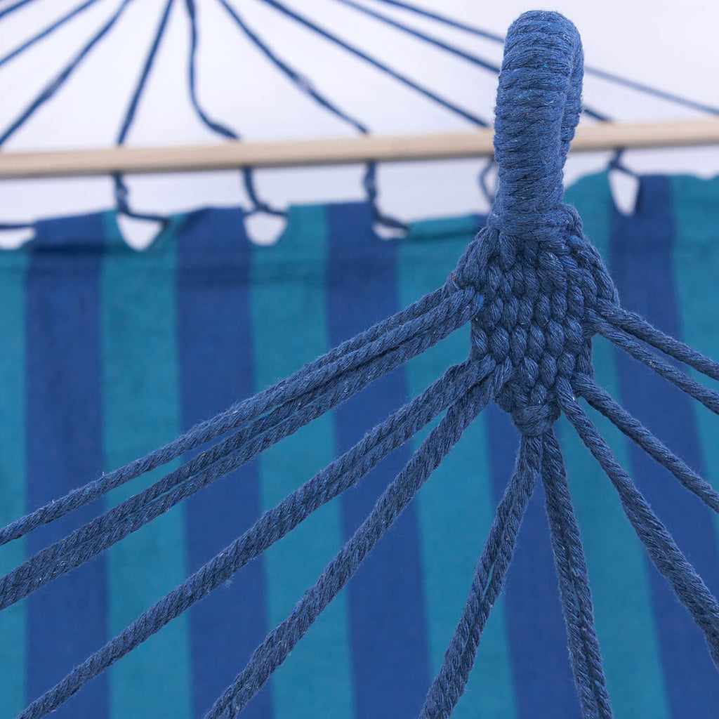 Hamac en polycoton rayé bleu et turquoise. Tissu doux et fin comme le coton et résistant, indéchirable et durable comme le polyester. Idéal pour le jardin, le camping ou la plage.