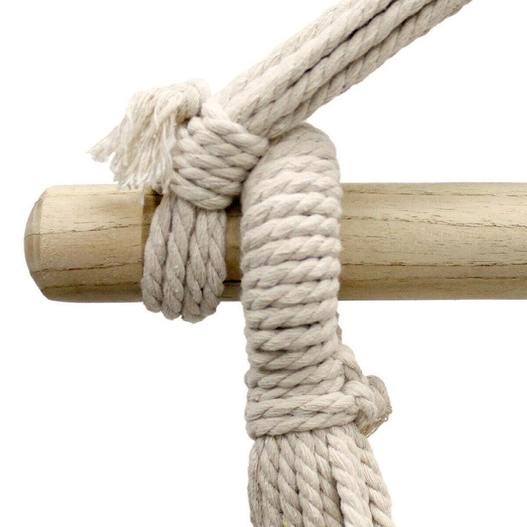 Confectionné en coton résistant de couleur écru, il est parfait pour la terrasse et le jardin, mais aussi pour le salon ou la chambre. Il s'adapte facilement à tout type de meuble et vous pouvez également y insérer des coussins pour le rendre encore plus beau et confortable. Son support en bois le rend très stable et facile à positionner : il suffit de l'accrocher à un crochet fixé au plafond et le tour est joué ! Se détendre à la maison en se balançant sur ce fauteuil suspendu sera un vrai plaisir, vous vous sentirez comme dans une oasis de paix.