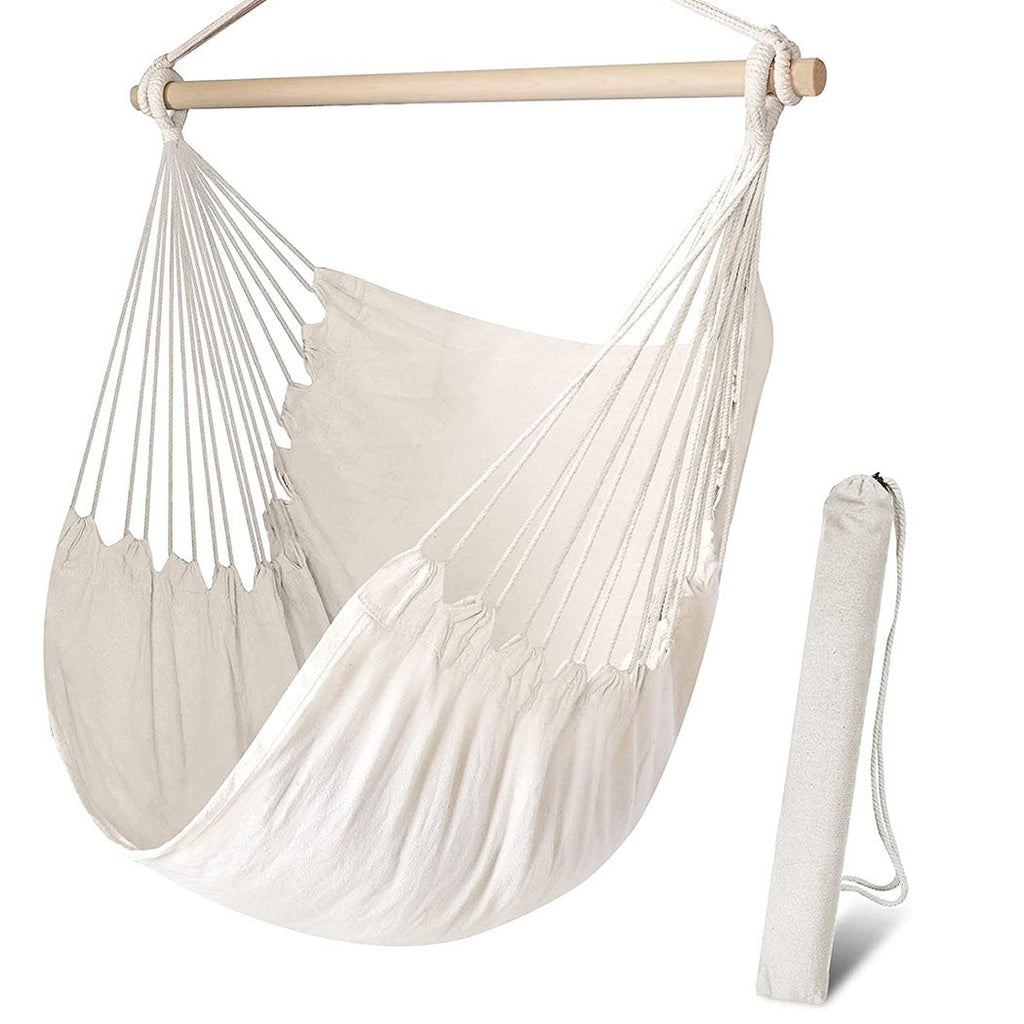 Hamac Fauteuil Suspendu Coton Ecru Support Bois Chaise Berçante De Jardin