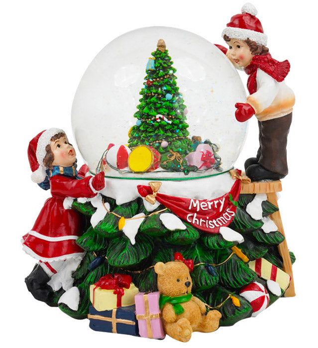 Ampolla Natalizia realizzata in resina con sfera contenente un albero di Natale con effetto Glitter in movimento. La decorazione dell'ampolla si arricchisce di statuine, realizzate in resina, raffiguranti bimbi.