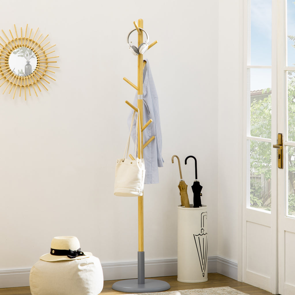 Il pratico appendiabiti è perfetto per preparare in anticipo l'abbigliamento e altri accessori come cappelli, cinture e borse senza creare confusione in giro. Il design alto e sottile si adatta facilmente all'ingresso di casa, al soggiorno, allo studio e agli uffici. Questo appendiabiti da terra è composto da otto appendini per riporre separatamente stoffe e borse, mentre la struttura in bambù con base rotonda in metallo offre una struttura solida.