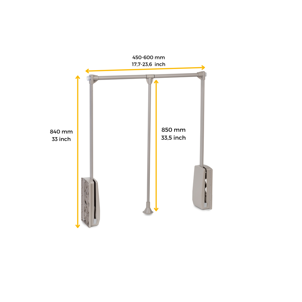 Le cintre d'armoire Hang vous permet d'accéder sans effort aux zones les plus hautes de l'armoire. La barre est réglable en largeur pour s'adapter au compartiment utile de l'armoire, en plus d'avoir un mouvement fluide avec retour amorti, elle a une capacité de charge maximale de 12 kg. En cas d'installation sur une armoire à portes battantes, nous recommandons le montage avec les entretoises latérales Hang 7085025/7085013/7085017/7085049.