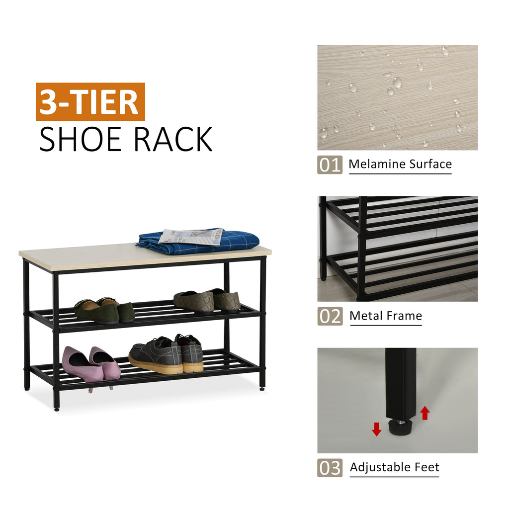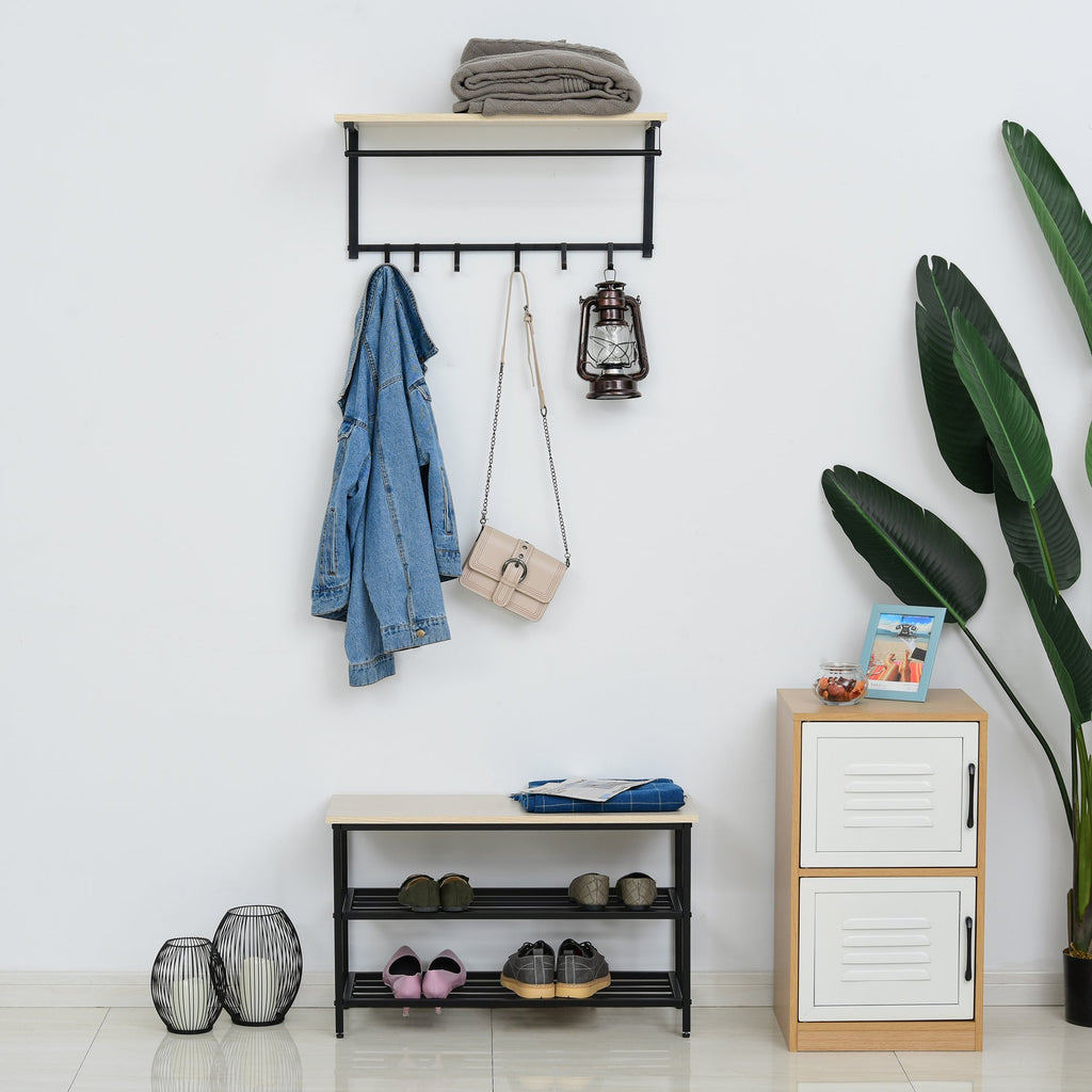Banc porte-manteau avec étagère à chaussures en bois et métal noir