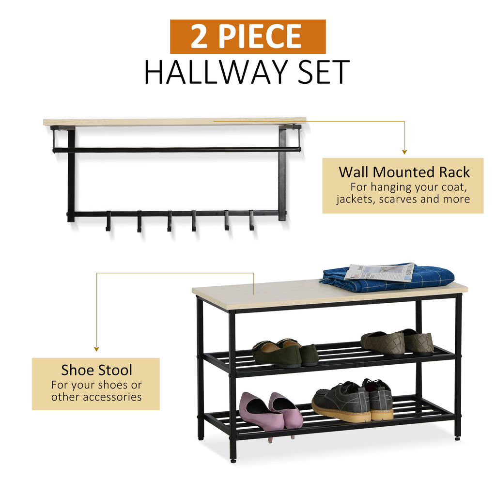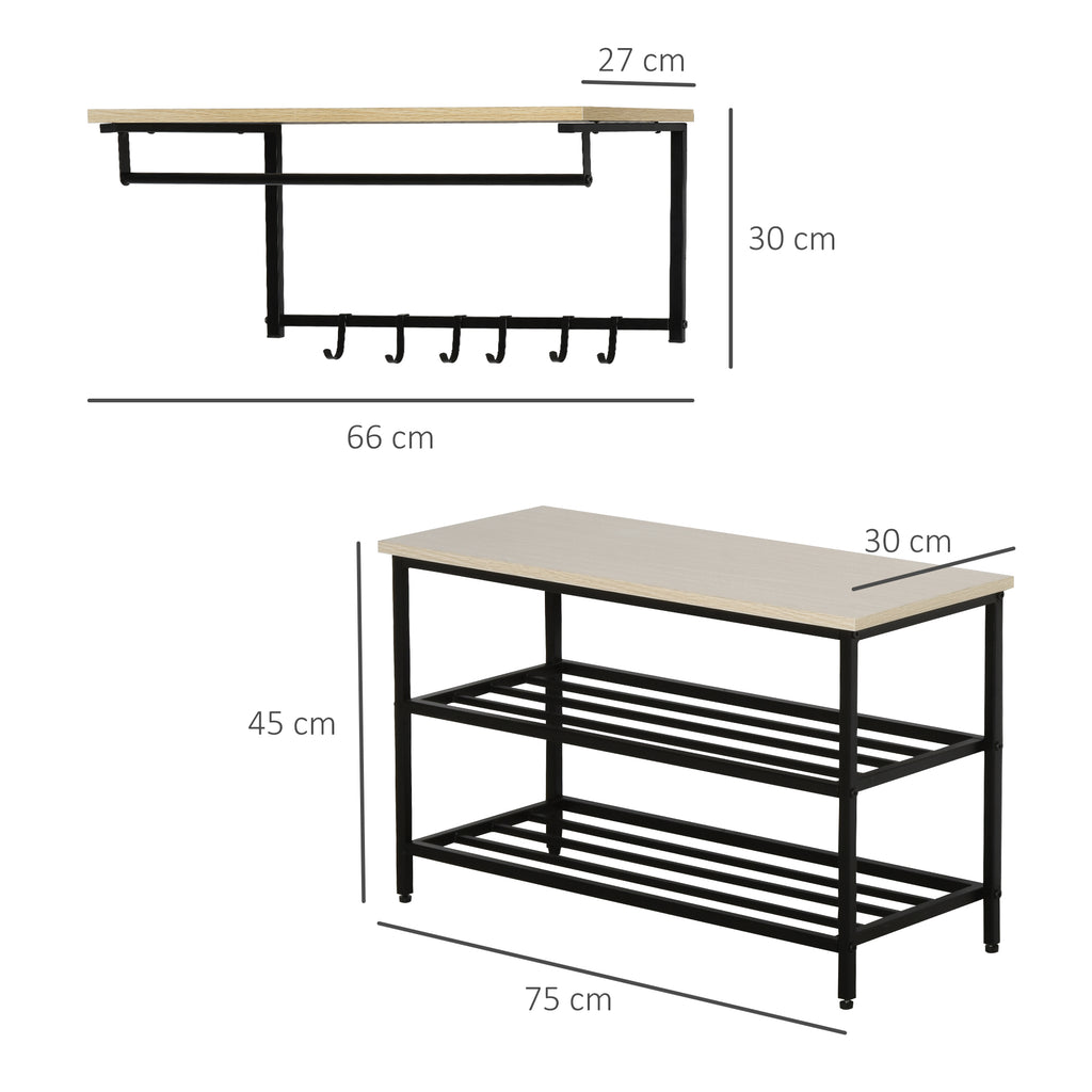 Ensemble cintre et étagère à chaussures, pour ranger manteaux, vestes, foulards et autres accessoires ! Fabriqué en panneaux de particules avec surface en mélamine et structure en métal, très durable et moderne. Cintre avec 6 crochets, étagère et étagère à chaussures avec 3 étagères, répond à tous vos besoins.