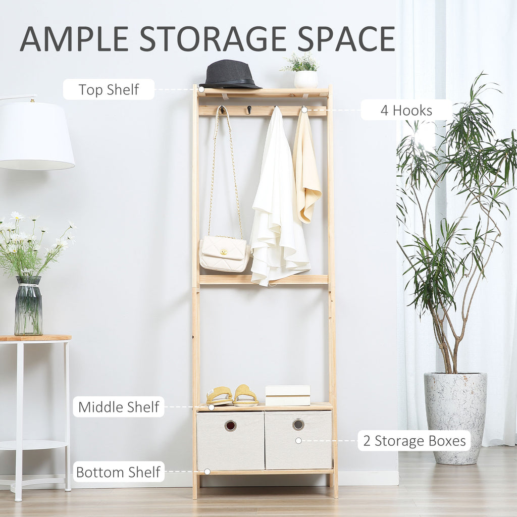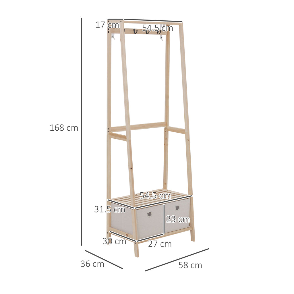 Gardez vos manteaux, vêtements et sacs bien rangés grâce au cintre. Il est équipé de 4 crochets et 3 étagères, ainsi que de 2 tiroirs en tissu pratiques, qui permettent de tout ranger de manière ordonnée. Le portemanteau comprend un dispositif anti-basculement, qui assure une stabilité optimale. Le style rustique avec structure en bois naturel non peint apporte une touche originale à n'importe quel environnement. Choisissez-le pour l'entrée, la chambre ou le salon !