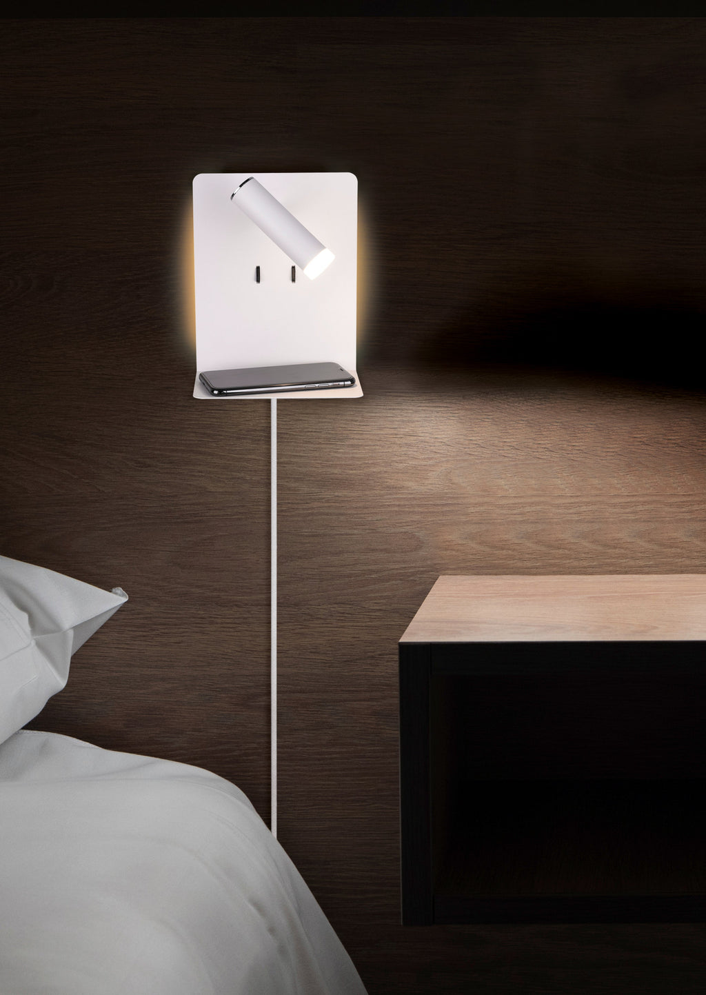 Element Applique Murale Led Rétroéclairée en Métal Blanc Avec Spot Avec Etagère Et Port Usb Pour Chargement Smartphone H.20cm