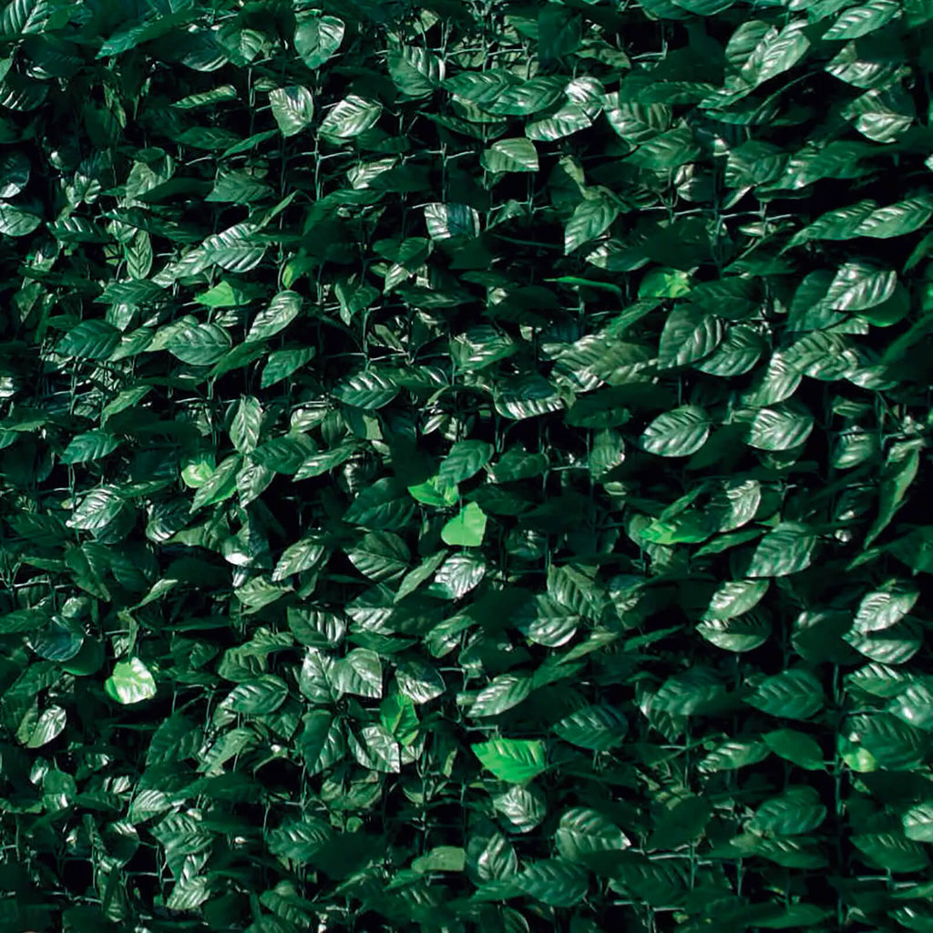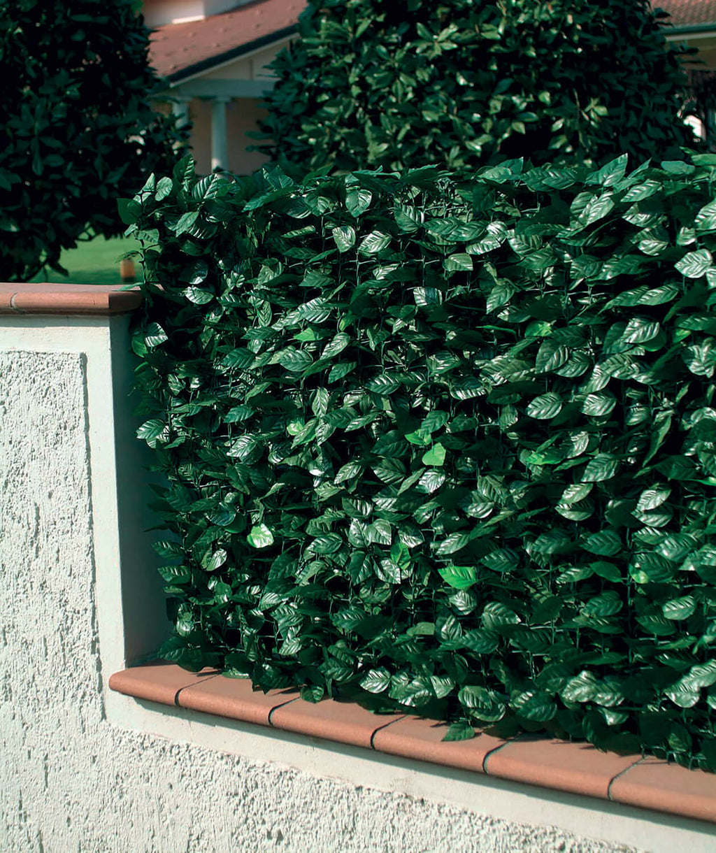 Haie artificielle avec feuilles de laurier ornementales en rouleaux avec support arrière rigide en treillis plastique extrudé et avec pousses, pour un excellent effet optique et un haut degré d'occultation. Le produit est traité pour résister aux rayons UV et conserve sa couleur d'origine inchangée dans le temps, remplaçant et s'intégrant à la haie naturelle. Il s'applique et s'enlève en quelques minutes sans outils, ne nécessite aucun entretien, n'attire pas les insectes, est résistant et protège du vent. Lavable avec un simple jet d'eau, idéal pour décorer, ombrager et protéger terrasses, balcons, portails, piscines, jardins, etc.