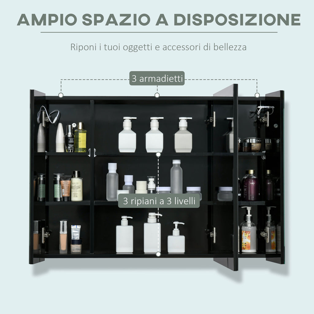 Meuble Miroir pour Salle de Bain 3 Portes 90x15x65 cm avec Eclairage LED Noir