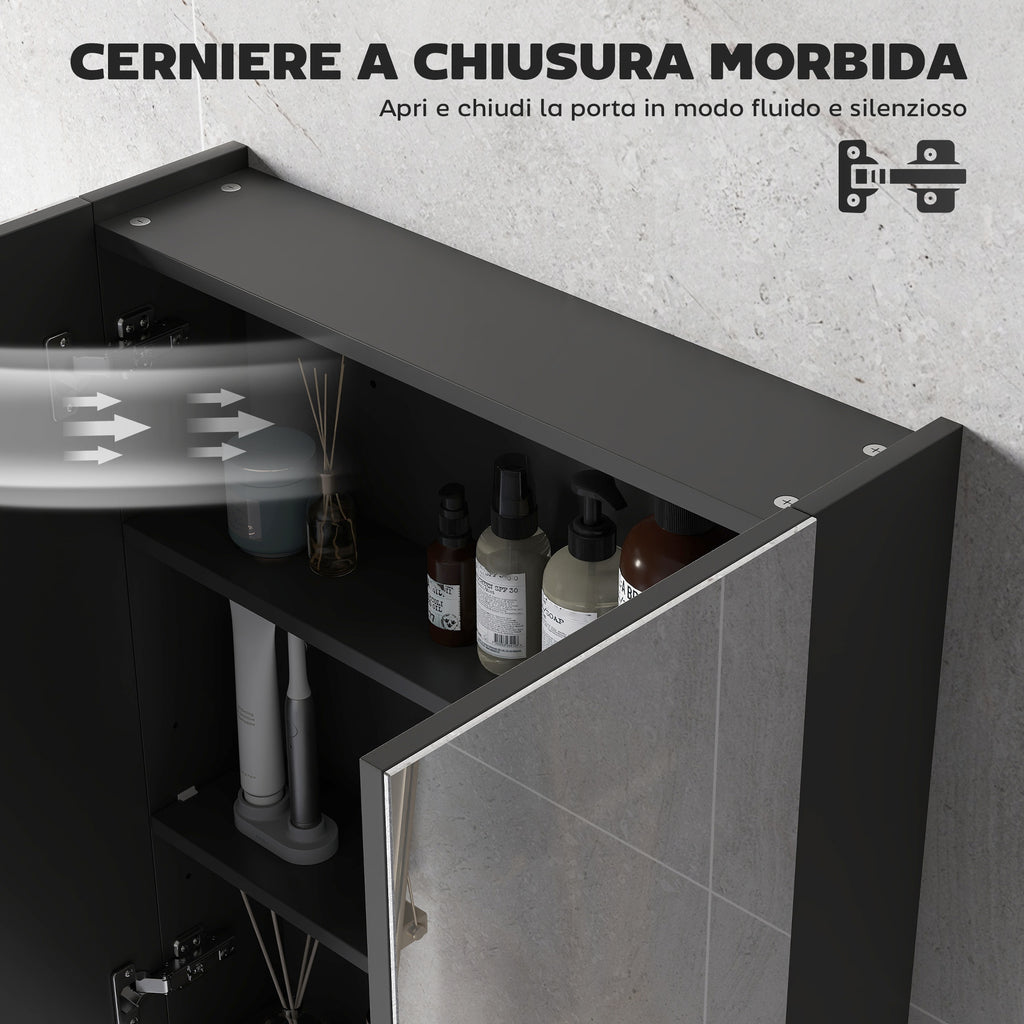 • DUE ANTE CON SPECCHIERA: Le ante di questo pensile da bagno sono dotate di due ampi specchi frontali. L'apertura delle due ante è fluida e controllata (con angolo di 90°) grazie alle apposite cerniere
