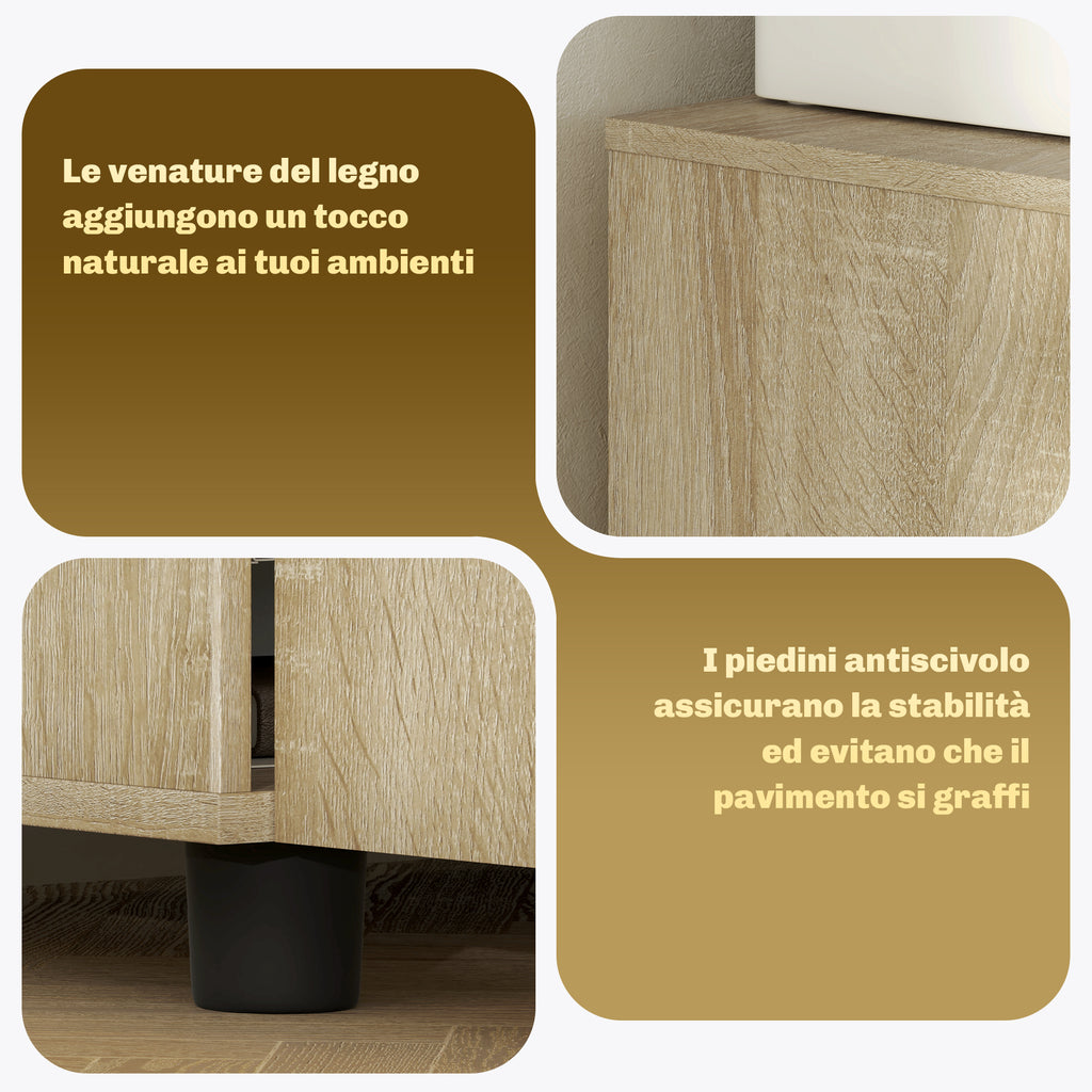 • RIVESTIMENTO IN MELAMMINA: Il mobiletto basso è rivestito in melammina, che rende la superficie liscia, facile da pulire e resistente ai graffi