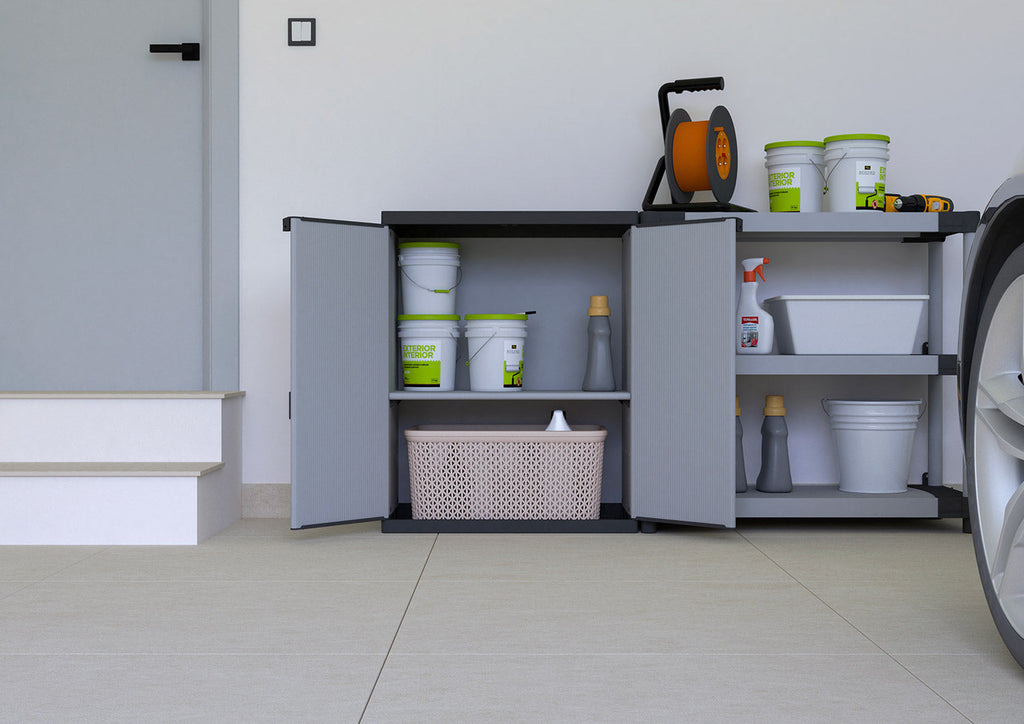 Armoire d'extérieur 34x39,5x85 cm 1 porte 2 étagères en résine grise