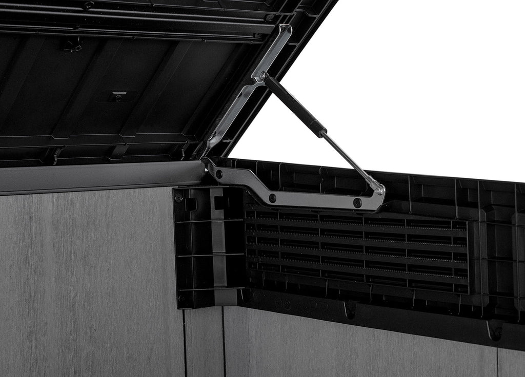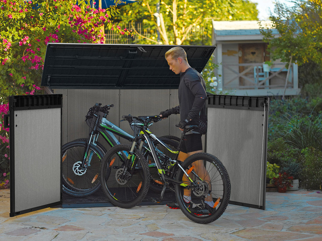 Grande-Store offre une solution durable et élégante pour votre jardin, terrasse ou balcon. La capacité de 2020 litres offre suffisamment d'espace pour deux vélos adultes et deux vélos pour enfants, des meubles de jardin, des outils de jardinage ou deux poubelles de 360 litres. Le sol est doté d'un bord incliné pour faciliter les manœuvres. Le couvercle est équipé de deux pistons et d'un système intégré de fixation des bacs. Grâce à la résistance aux agents atmosphériques des panneaux DUOTECH?, Grande-Store est destiné à durer longtemps.