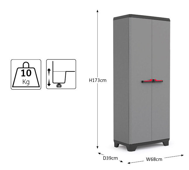 Dotato di un design caratteristico con particolari rossi e neri, l'armadio Stilo Portascope comprende 3 ripiani regolabili con una portata massima di 10 Kg ciascuno, chiusura con predisposizione per lucchetto e maniglie con comoda impugnatura.