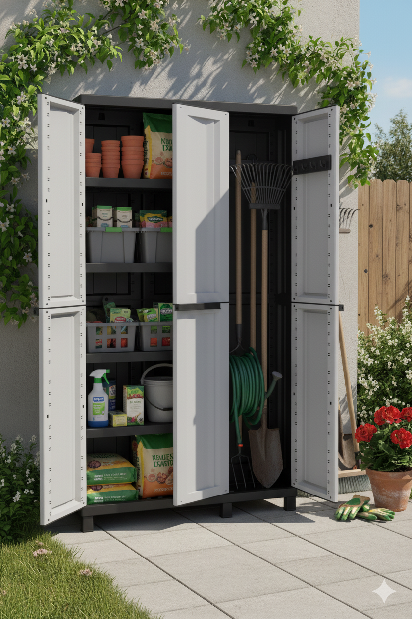Armoire multifonctionnelle à 3 portes composée de deux compartiments séparés : un compartiment de plein étage développé horizontalement avec 3 étagères internes réglables en plastique et un compartiment libre développé verticalement. Porte pratique ouvrant jusqu'à 180°. Fabriqué en polypropylène avec possibilité de fermeture avec un cadenas.
