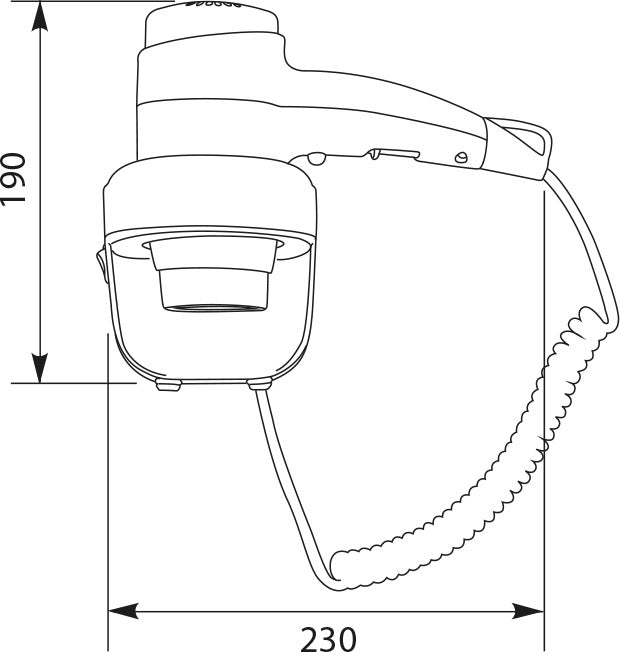 Il est activé en maintenant enfoncé le bouton d'alimentation, l'empêchant d'être laissé dans la pièce allumé et sans surveillance. Utilisation et entretien en toute sécurité grâce au thermostat de sécurité dont est équipé le sèche-cheveux et à l'interrupteur marche-arrêt situé sur le socle mural.