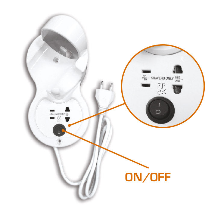 - Finitions chromées élégantes, base murale en ABS blanc avec prise rasoir 220/110 V