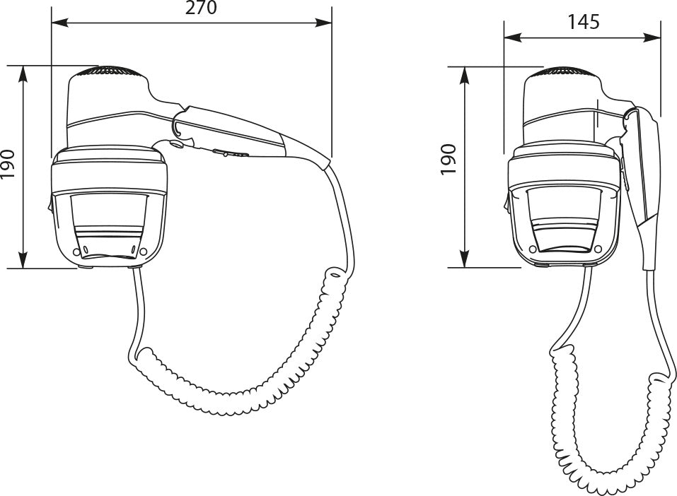 - Câble spiralé souple entre le sèche-cheveux et le socle mural, longueur 60/120 cm