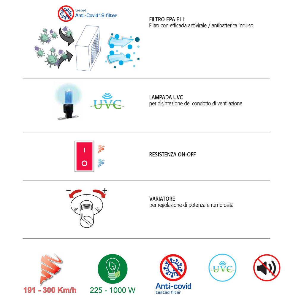 - Économies d'énergie maximales, consommation allant de 225W à 1000W (225W avec résistance désactivée et variateur au minimum - 1000W avec résistance activée et variateur au maximum)