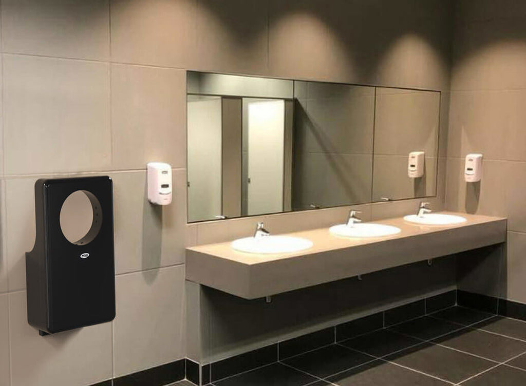 Sèche-mains à jet circulaire . Hygiène maximale grâce à l'absence de points de contact avec les mains et à la peinture spéciale ABS antibactérienne.