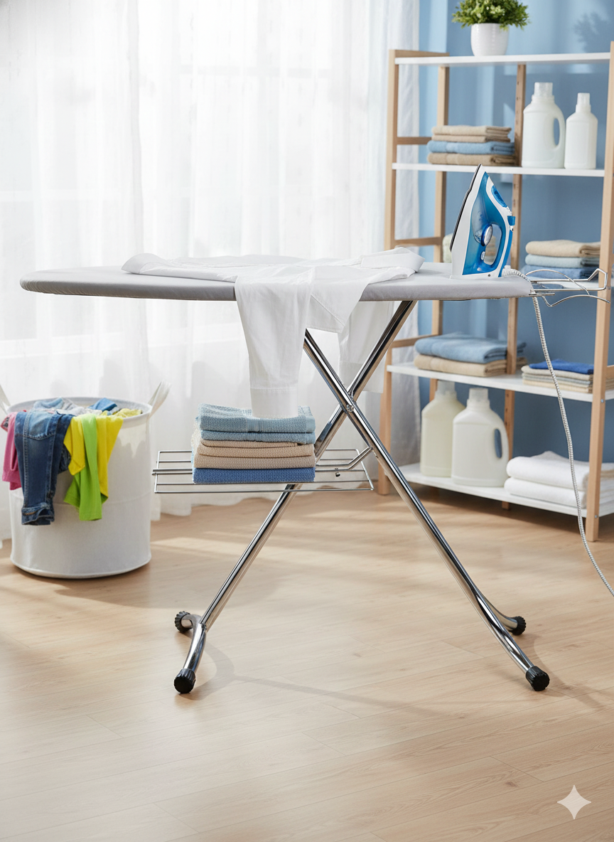 L'altezza è regolabile per adattarsi alle tue esigenze, permettendoti di stirare comodamente sia in piedi che seduto. Il design salvaspazio ti permette di riporlo facilmente quando non in uso, occupando il minimo ingombro.