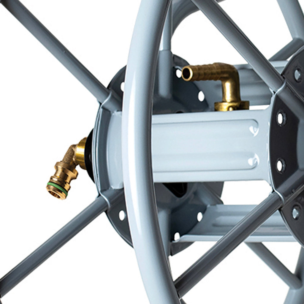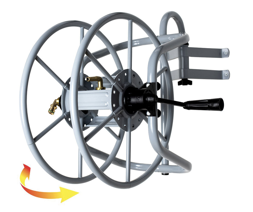 Enrouleur mural tournant, capacité 50 mètres de tuyau 1/2", fourni avec des raccords en laiton en acier peint avec une poudre polyester spéciale non toxique, pour assurer robustesse et durabilité.