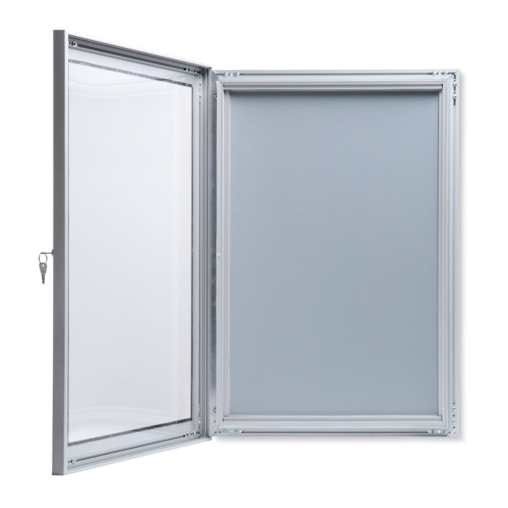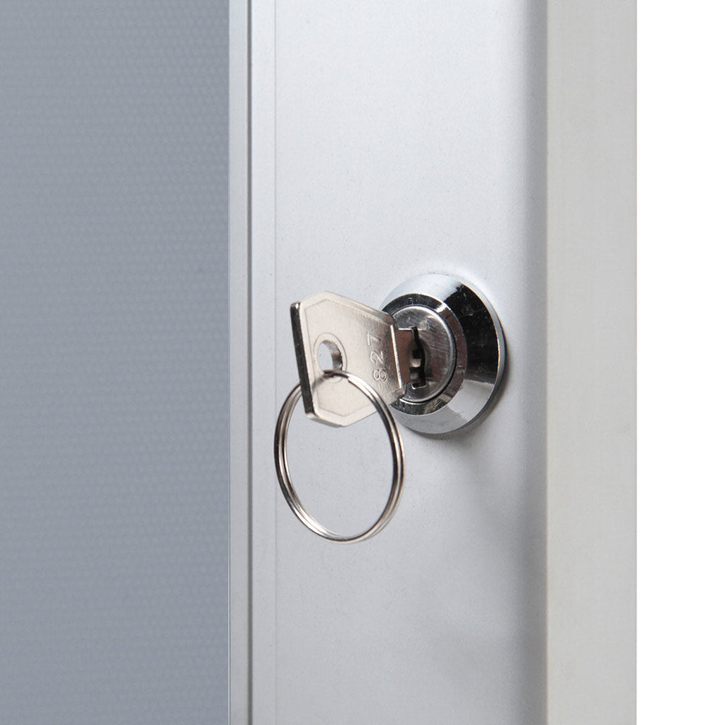 La bacheca porta poster è realizzata in alluminio anodizzato silver, conferendole un aspetto elegante e resistente. Il fondo è realizzato in materiale plastico e dispone di una clip di fissaggio interna per mantenere il poster in posizione. La anta è in policarbonato e si apre a battente. La bacheca dispone di una serratura singola per garantire la sicurezza dei contenuti. È incluso anche un kit per il fissaggio a parete. Le dimensioni della bacheca sono di 38,7x51x3,3 cm.