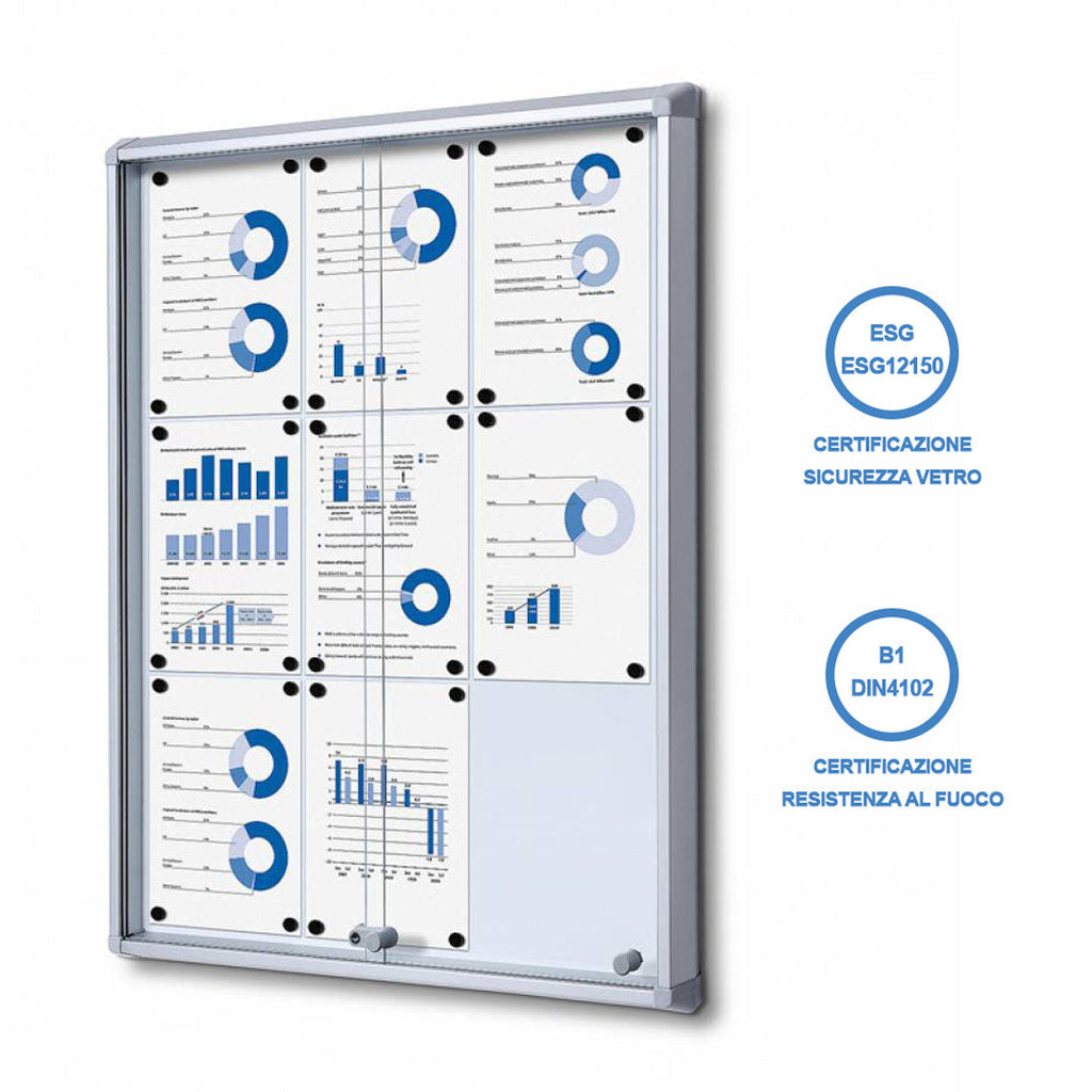 Questa bacheca per interni magnetica è realizzata in alluminio resistente e angoli di sicurezza in ABS per garantire la massima durata nel tempo. La superficie in acciaio laccato è magnetica e può essere anche utilizzata per scrivere a secco. Le ante in vetro temperato assicurano la sicurezza e sono dotate di apertura scorrevole e chiusura con serratura. Certificata per la resistenza al fuoco e per la qualità del vetro temperato, questa bacheca include anche un kit per il fissaggio a parete. Il suo formato 9XA4 e le dimensioni di 72x98,2x5,9 cm la rendono perfetta per un uso pratico e funzionale in qualsiasi ambiente.