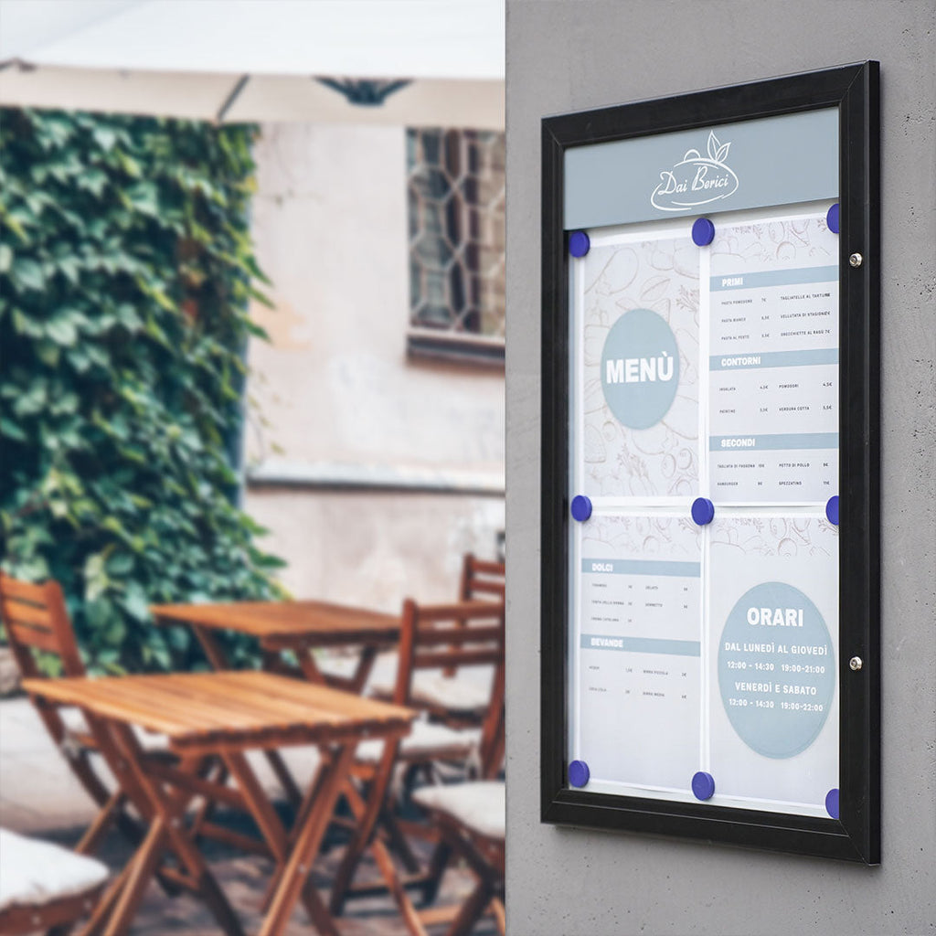 La bacheca per esterni è realizzata in alluminio verniciato a polveri nero, garantendo resistenza agli agenti atmosferici. Il fondo della bacheca è in acciaio laccato magnetico, consentendo di scrivervi sopra con facilità. L'anta è trasparente e realizzata in policarbonato, consentendo la visualizzazione dei documenti all'interno della bacheca. L'apertura a battente è dotata di serratura con chiavi incluse. La bacheca ha anche un pannello di intestazione personalizzabile con logo o rimovibile. Il kit per il fissaggio a parete è incluso e comprende viti M3 e tasselli per fori da 6,5 mm. Il formato è 4xA4 e le dimensioni della bacheca sono 51,5x79,0x2,3 cm.
