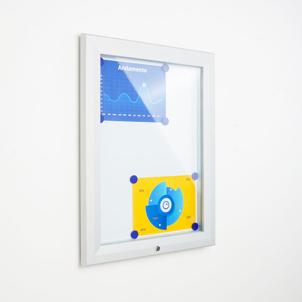 La bacheca per esterni è realizzata in alluminio estruso, con spigoli arrotondati e anodizzati in colore silver. Il fondo della bacheca è magnetico, scrivibile e cancellabile, realizzato in acciaio laccato bianco. L'apertura della bacheca avviene a ribalta, ed è realizzata in vetro temperato, dotata di serratura e fornita con 2 chiavi. La bacheca è certificata per la resistenza del vetro temperato ESG e all'acqua e alla polvere grazie al grado di protezione IP56. Viene fornita con pistoni a gas e kit di fissaggio a parete, ed ha un formato che può contenere fino a 4 fogli A4, con dimensioni complessive di 58,5x76x4,7 cm.
