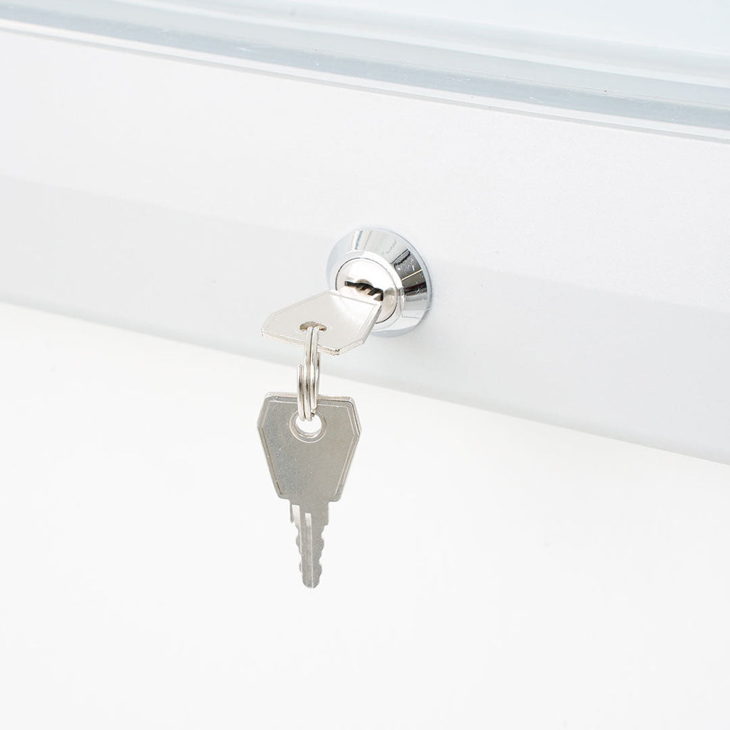 La bacheca per esterni è realizzata in alluminio estruso, con spigoli arrotondati e rivestimento anodizzato silver. Il fondo è magnetico, scrivibile e cancellabile, realizzato in acciaio laccato bianco. La bacheca si apre a ribalta attraverso un vetro temperato con serratura, fornita di 2 chiavi. All'interno è presente un'illuminazione a LED con trasformatore integrato, certificata vetro temperato ESG. La bacheca è resistente all'acqua e alla polvere, con grado di protezione IP56. Per il fissaggio a parete è incluso un kit, con formato per contenere 6 fogli A4 e dimensioni di 80,5x76x4,7 cm.