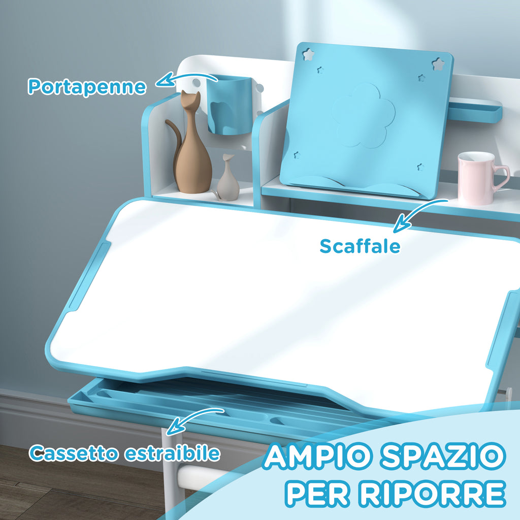 Banco Scuola per Bambini con Piano Inclinabile con Sedia Altezza Regolabile Blu