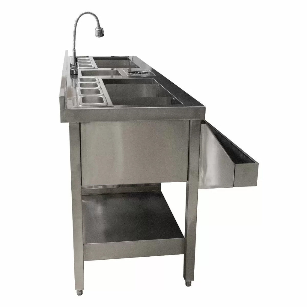 Fabriquée en acier inoxydable #304 de qualité alimentaire de haute qualité, cette grande station de bar est extrêmement durable et facile à nettoyer. Le lave-verres avec bac collecteur offre une excellente polyvalence, essentielle pour nettoyer rapidement les verres et les refroidir à la température idéale. L'évier intégré est équipé d'un mitigeur rotatif à 360 degrés, qui garantit un lavage simple et sans tracas, tout votre équipement est toujours prêt à l'emploi.