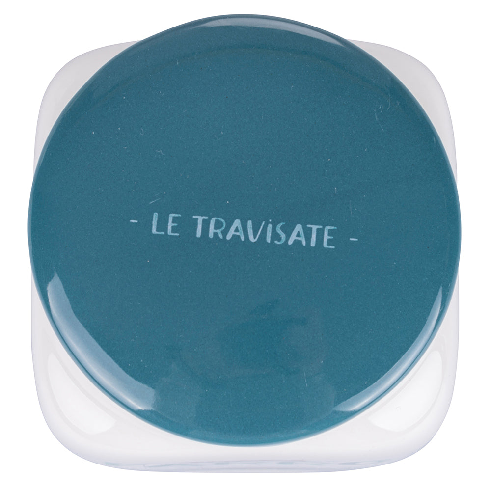 - Couleur : blanc avec écriture aigue-marine et beige, couvercle bleu sarcelle