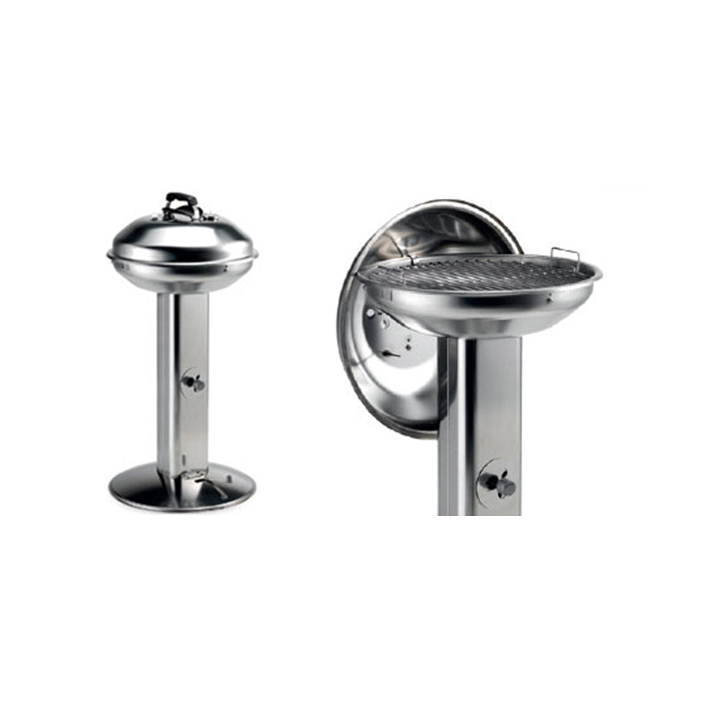 Barbecue en acier inoxydable. Pied de colonne en acier inoxydable avec prise d'air réglable et dispositif d'allumage inclus. Recueillir les cendres et le dispositif d'évacuation. Couvercle en acier inoxydable qui permet la cuisson au four. Grille de cuisson en acier chromé certifiée alimentaire. Brasero robuste en acier inoxydable.