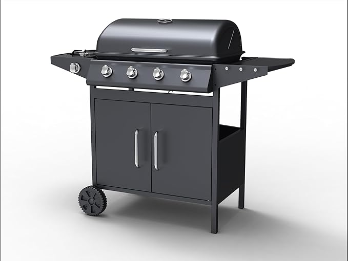 Scopri il barbecue a gas "Martin" nero, un alleato perfetto per le tue grigliate all'aperto! Questo barbecue a 4+1 fuochi con accensione piezoelettrica combina funzionalità e stile, con una robusta cappa in acciaio nero opaco dotata di termometro per controllare la temperatura durante la cottura. La griglia in acciaio inox 430, da 64x37 cm, offre ampio spazio per preparare deliziose pietanze. I quattro fuochi centrali con potenza del fuoco principale di 8500 BTU/HR (2,5 kW), controllati da manopole in ABS, e il bruciatore laterale extra permettono di cuocere diverse preparazioni contemporaneamente, ideali per ogni esigenza di cottura. Facile da spostare grazie alle due ruote da 6" e dotato di porta anteriore, questo barbecue è perfetto per le tue grigliate estive. Richiede una bombola GPL (non inclusa). Scegli il barbecue "Martin" per un'esperienza di cottura semplice, efficace e di stile!