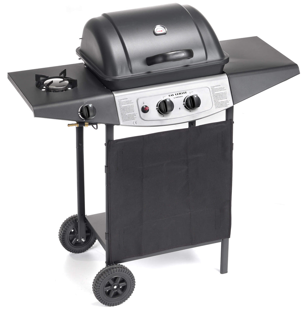 Barbecue à gaz 4939 Double avec chambre de combustion, couvercle complet avec thermomètre, étagère inférieure et étagères latérales en acier peint.