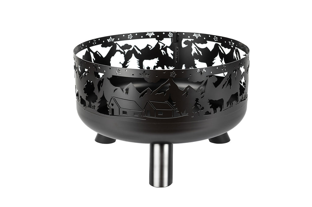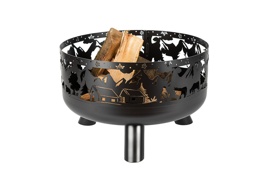 Il braciere SOFFIO ha intagli che raffigurano un paesaggio alpino. Quando il fuoco è acceso al suo interno, la luce proietta questi dettagli, creando un'ambientazione suggestiva con ombre che richiamano il paesaggio di montagna. Le proiezioni possono evocare un'atmosfera calda e accogliente, ideale per ambienti rustici o serate all'aperto. La struttura è solida, dotata di tre piedi stabili per un appoggio sicuro su qualsiasi superficie.