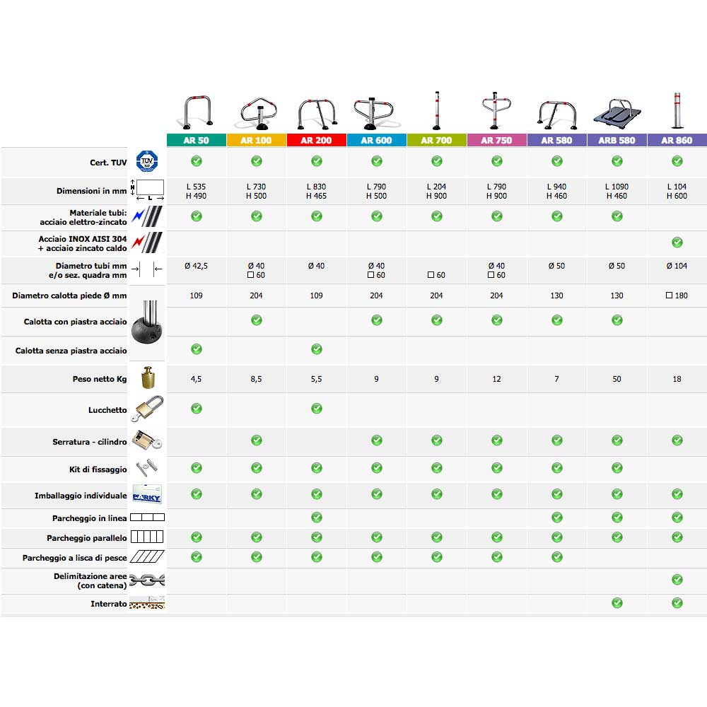 La borne Parky® Barriers AR50 est une borne manuelle pour la protection du stationnement. Il a une forme en "U" inversé, avec des pieds de fixation en polyamide (nylon) renforcé de fibre de verre à la base, qui ont une forme arrondie pour ne pas endommager les pneumatiques. Le corps de la borne est en acier électrozingué avec traitement anti-corrosion, ce qui la rend praticable lors des manœuvres et extrêmement résistante aux chocs, chevauchements et écrasements, au vandalisme et à la corrosion (galvanisation à chaud). Produit certifié TÜV.