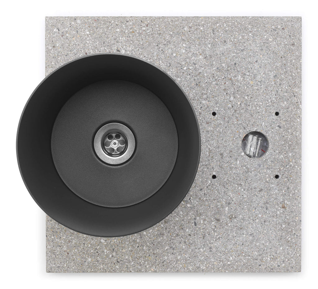 Base en granulats de ciment avec plateau peint avec drain. Pour fontaines à grand anneau (toutes sauf 42/PS, 42/SR et 42/PSI). Complet avec vis et chevilles.
