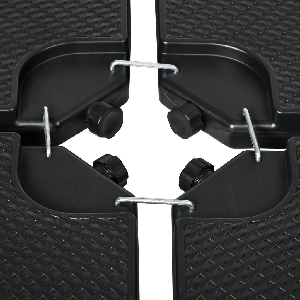 Il nostro set di 4 basamenti per ombrellone a sbalzo è il supporto perfetto per reggere gli ombrelloni durante tutta la bella stagione. Aggiungi acqua o sabbia all'interno dei pesi per arrivare fino a 80 kg e creare la giusta robustezza. Le basi sono facili da trasportare e impilabili grazie alle maniglie incorporate, mentre la struttura è realizzata in plastica HDPE per l'esterno. I 4 basamenti per ombrellone stabilizzano un ombrellone a sbalzo. Base ombrellone adatta ai modelli 84D-187 e 84D-161. Base per ombrellone con superficie effetto rattan per ogni arredamento. Base per ombrelloni realizzata in plastica HDPE per l'esterno, resistente all'acqua e alle intemperie. Il set pesa 60 kg quando riempito d'acqua o 80 kg quando riempito di sabbia. Maniglie integrate per consentire un trasporto facile. I pesi sono impilabili per facilitare la conservazione. I fermi metallici bloccano insieme i piatti. Base a croce non inclusa.