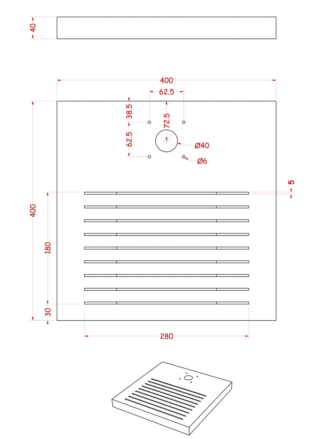 - Dimensions : L 40 x P 40 x H 4 cm